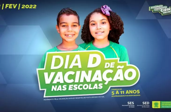O Governo de MS, por intermédio da Secretaria de Estado de Educação (SED) e Secretaria de Estado de Saúde (SES), realizará, no dia 21 de fevereiro (segunda-feira), a campanha “Estudante Inteligente Confia na Ciência – Vacine-se!”, que visa fazer a busca ativa dos estudantes de 05 a 11 anos das redes pública e privada de ensino dos 79 municípios de Mato Grosso do Sul.