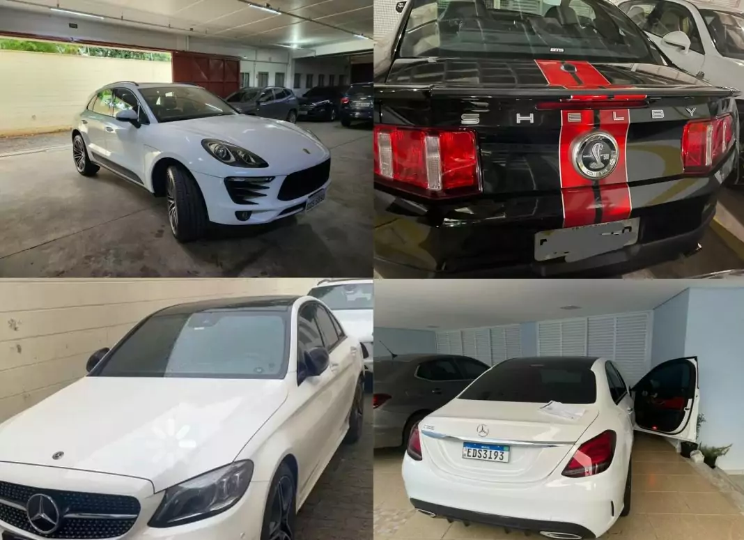 Dentre os veículos apreendidos, chamam a atenção automóveis esportivos de luxo, como um Porsche, um Mustang Shelby, uma Mercedes, além de Dodge Ram, Volvo e Land Rover, conforme divulgado pela Polícia Civil.