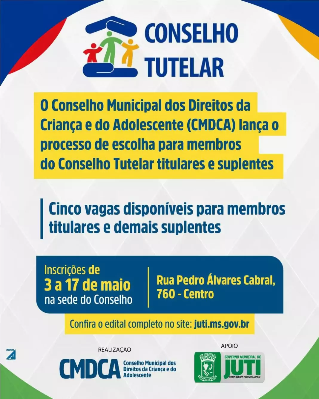 A Prefeitura de Juti e o Conselho Municipal dos Direitos da Criança e do Adolescente (CMDCA) abriram nesta quarta-feira, 3 de maio, o processo de escolha para membros do Conselho Tutelar titulares e suplentes.