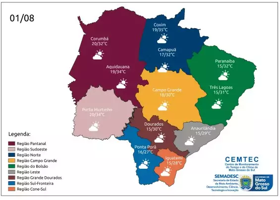 A região norte e pantaneira, como Coxim e Aquidauana, registram as mais altas temperaturas previstas, de 34°C a 35°C. Em Campo Grande, o sol fica entre nuvens, com mínima de 18°C e máxima 30°C.