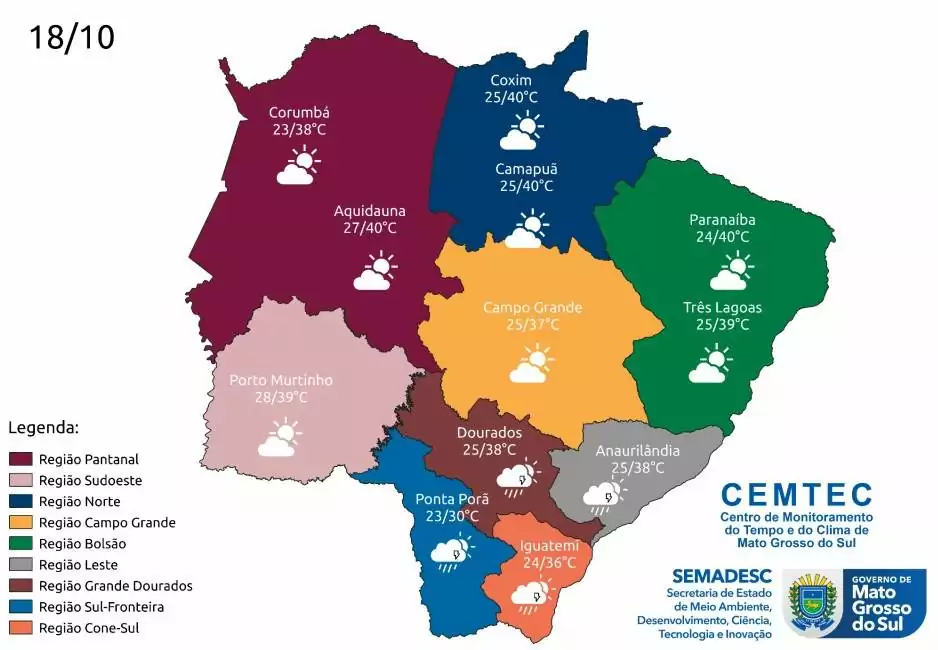 Porto Murtinho amanhece com 28°C e atinge os 39°C. Na região pantaneira, a mínima será de 23°C e a máxima alcança os 40°C. No norte, Coxim terá 25°C cedo e alcançará os 40°C ao longo do dia, assim como Camapuã. No Bolsão, Paranaíba registra 24°C pela manhã, com máximas que também podem atingir os 40°C.