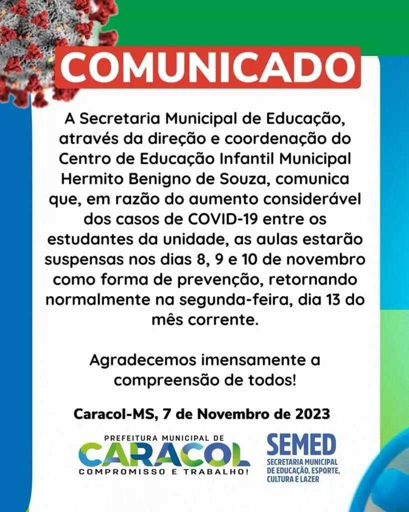 A Secretaria Municipal de Educação, por meio da direção e coordenação do Centro de Educação Infantil Municipal Hermito Benigno de Souza, comunica a paralisação das aulas na unidade entre os dias 8 e 10 de novembro.