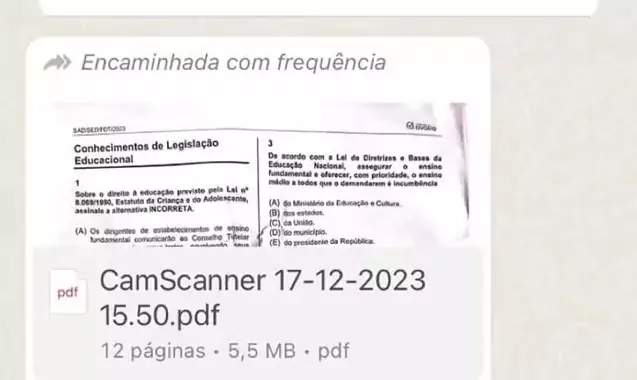 O arquivo com 12 páginas em formato PDF foi compartilhado, e mostra as 30 questões da prova em branco. O material tem até a logomarca do Instituto Avalia, responsável pela formulação do exame. “A prova foi fotografada e distribuída. Esse scanner está rodando nos grupos e está em branco”, relata um participante que entrou em contato com a redação.