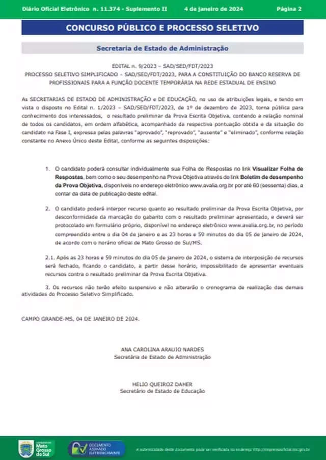Foi divulgado o resultado preliminar do processo seletivo para professor temporário da Rede Estadual de Ensino (REE), nesta quinta-feira (4), em Mato Grosso do Sul. O processo seletivo causou polêmicas no ano passado e repercutiu pelas redes sociais, após denúncias de vazamento da prova e atraso da abertura dos portões.