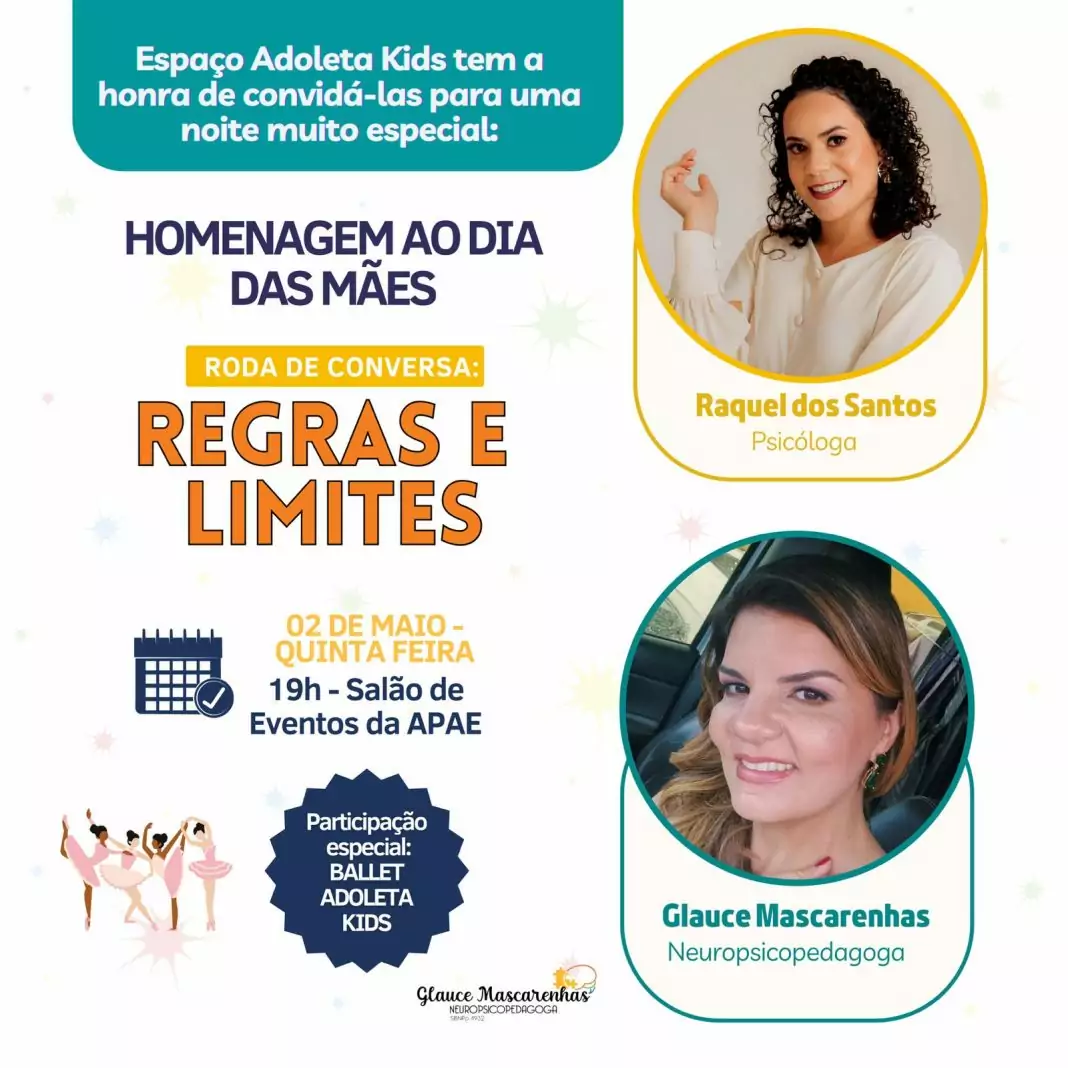 Um dos grandes desafios dos dias atuais é estabelecer limites para os filhos, por isso, as profissionais Glauce e Raquel abordarão o tema de forma lúdica e objetiva, apresentando métodos e dicas para as mães.