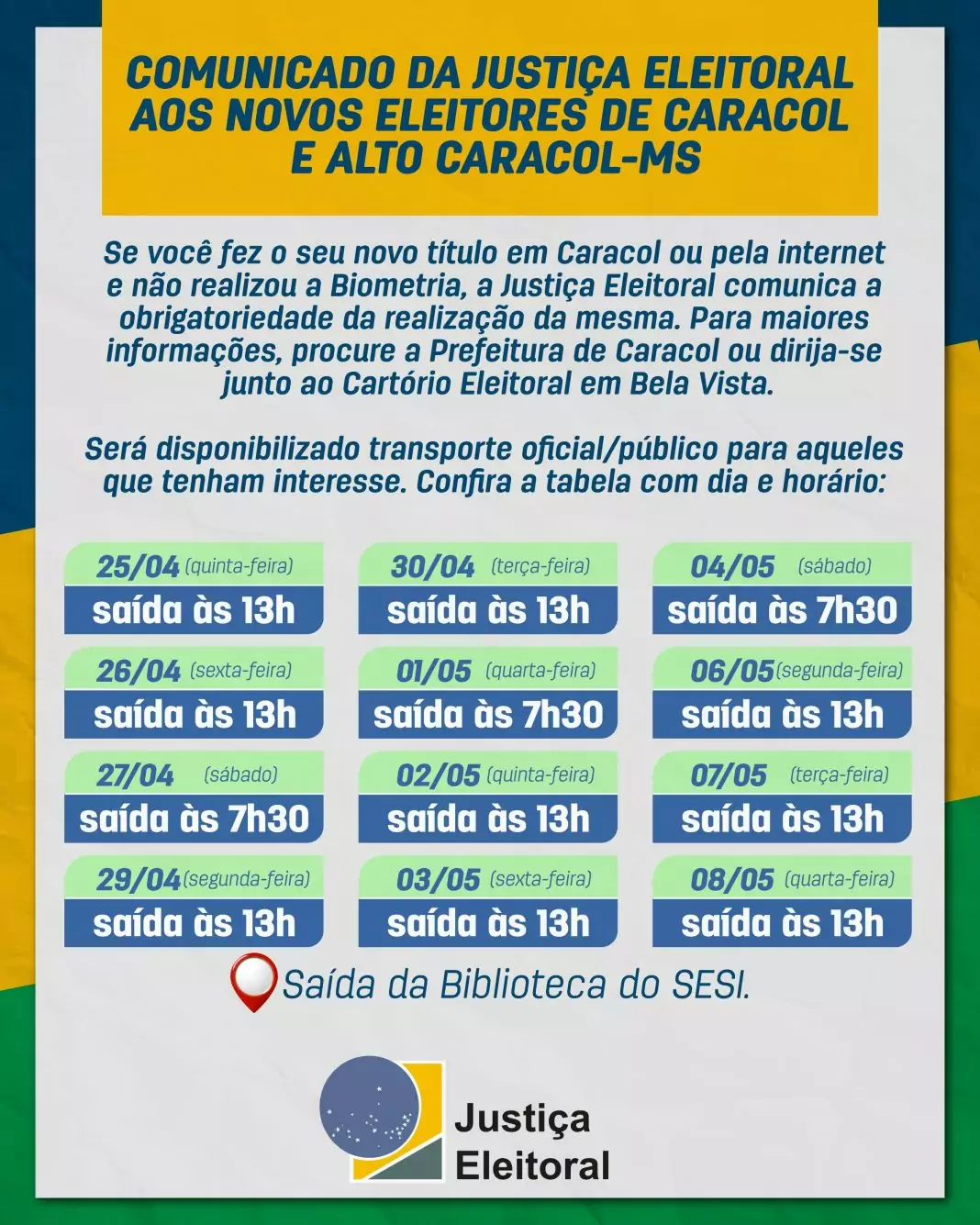 A Justiça Eleitoral de Bela Vista convoca os novos eleitores do município de Caracol e do Distrito de Alto Caracol que fizeram seus títulos na cidade ou pela internet para realizar a Biometria entre os dias 25 de abril e 7 de maio.