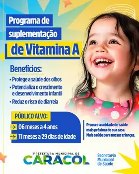 A Prefeitura de Caracol, por meio da Secretaria Municipal de Saúde, está realizando o Programa Nacional de Suplementação de Vitamina A (PNSVA), uma iniciativa do Ministério da Saúde criada em 2005 com o objetivo de reduzir a deficiência de vitamina A em crianças no Brasil.