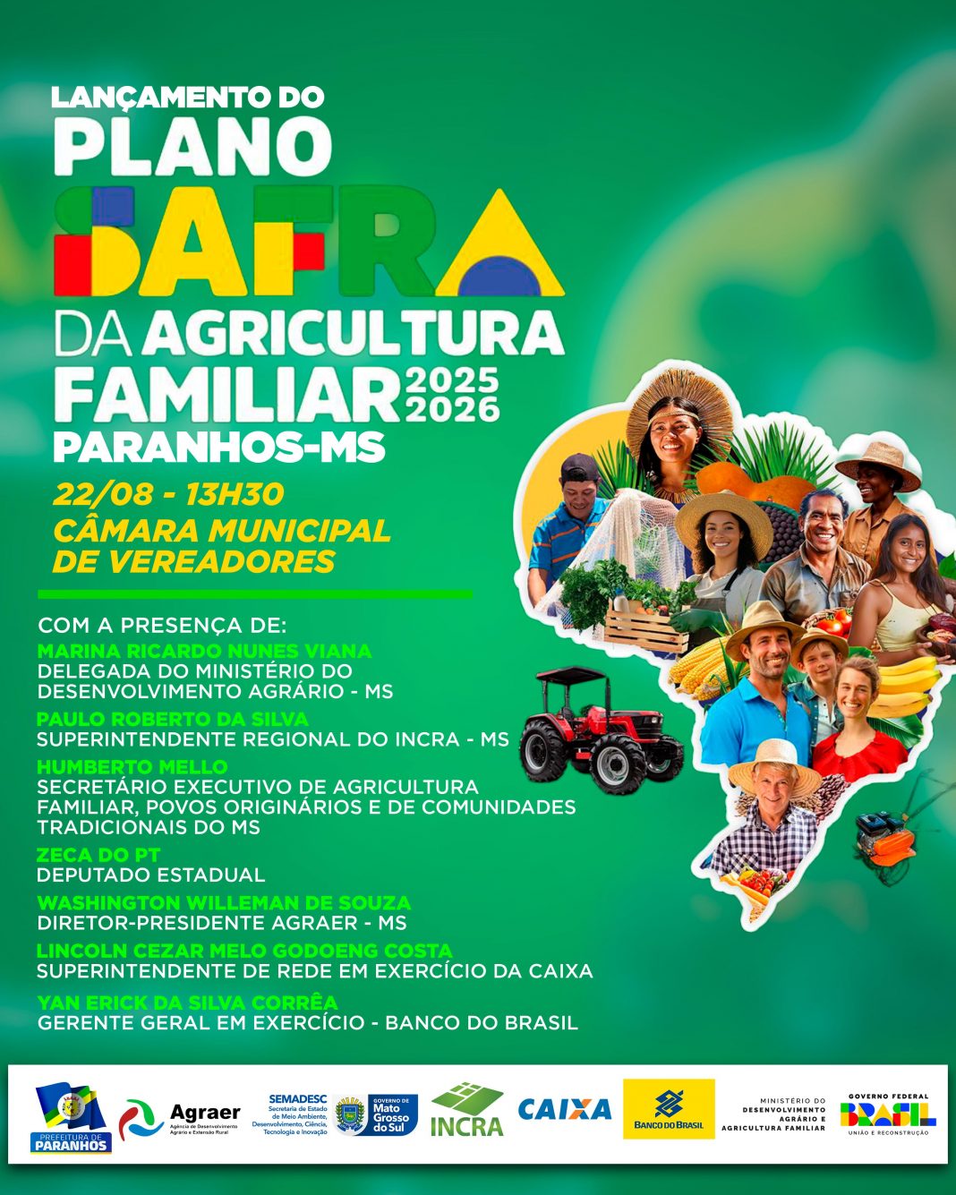 Estão confirmadas as presenças de Marina Ricardo Nunes Viana, Delegada do Ministério do Desenvolvimento Agrário de MS; Paulo Roberto da Silva, Superintendente Regional do INCRA MS; Humberto Mello, Secretário Executivo de Agricultura Familiar, Povos Originários e de Comunidades Tradicionais do MS; Zeca do PT, Deputado Estadual; Washington Willeman de Sousa, Diretor-Presidente da AGRAER MS; Lincoln Cezar Melo Godoeng Costa, Superintendente de Rede em Exercício da Caixa; e Yan Erick da Silva Corrêa, Gerente Geral em Exercício do Banco do Brasil.