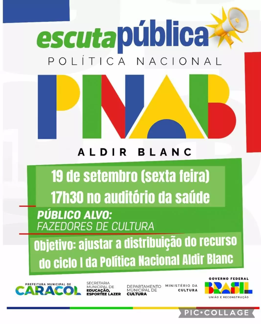 A Prefeitura Municipal de Caracol, por meio da Secretaria de Educação e Cultura, informa que no dia 19 de setembro, às 17h30, será realizada escuta pública no auditório da saúde.